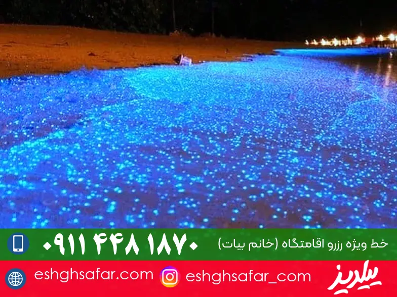 حضور فیتوپلانگتونها در آب بهدلیل داشتن سبزینه، دریا را به رنگ سبز نشان میدهد. وقتی دریا ناآرام میشوند، این موجودات از خود نور آبی ساطع میکنند. این پدیده بیشتر در ظهر پاییز رخ میدهد؛ البته این درخشش در شب جلوهای چند برابر دارد. قدم زدن شبانه روی شنهای ساحل نقرهای، زمانی که چراغ قوه به دست دارید بسیار خاطرهانگیز خواهد بود و ذرات درخشان شنهای ساحل زیر نور چراغ بسیار جلوه پیدا میکنند.